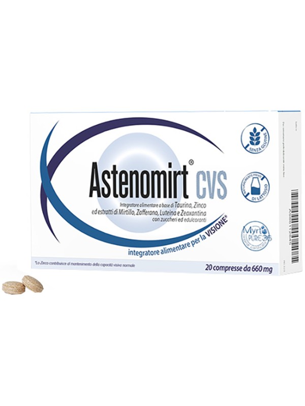 Zucchero (saccarosio, 0,25% sciroppo di glucosio essiccato), maltodestrine, taurina, myrto PURE 36 (Vaccinium myrtillus L.) frutti estratto secco titolato 36% in antocianosidi come antocianidine (mirtillo, maltodestrina); Tagete (Tagetes erecta L.) fiori estratto titolato 10% in esteri di luteina e 4% in zeaxantina (tagete; agenti di carica: cellulosa microcristallina, calcio fosfato bibasico; agente antiagglomerante: silicio biossido; stabilizzanti: estratto ricco in tocoferolo, ascorbil palmitato); destrosio, zinco gluconato; agente antiagglomerante: sali di magnesio degli acidi grassi, zafferano (Crocus sativus L.) stigmi estratto secco titolato 2% in safranale e 2% in crocina (zafferano, maltodestrina); aroma: mirtillo; edulcoranti: sucralosio, glicosidi steviolici (da foglie di stevia rebaudiana Bertoni); agente antiagglomerante: silicio biossido.
