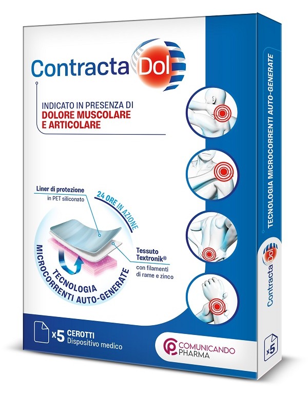 ContractaDol senza sostanze è un cerotto indicato per il dolore muscolare o articolare in grado di dare sollievo dal dolore muscolare e articolare di varia natura. Grazie alla sua azione occlusiva e alle microcorrenti auto-generate, protegge la zona da trattare e favorisce una sensazione di calore. ContractaDol senza sostanze si applica topicamente per mezzo della sua matrice adesiva. Gli elettroliti presenti sulla superficie della cute e gli estratti vegetali mescolati alla matrice adesiva creano un ambiente umido necessario per la generazione delle microcorrenti. Una volta applicato sull’area corporea interessata, il dispositivo, attraverso una reazione elettrochimica, sfrutta il potenziale bioelettrico endogeno che, a contatto con i filamenti di rame e zinco presenti nel tessuto che lo compone, produce microcorrenti. La capacità occlusiva del cerotto, in associazione alle microcorrenti e ai microcampi autogenerati, favoriscono un aumento di temperature che dona sollievo dal dolore muscolare e articolare.