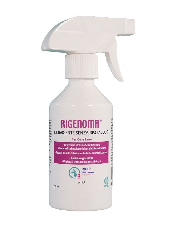 Detergente senza risciacquo con Ozoile consente una detersione atraumatica ed indolore della cute lesa indipendentemente dall’eziologia della lesione. La combinazione di Ozoile con l’acido lattico in una formulazione a pH 4,2 crea un ambiente ostile alla proliferazione microbica e l’impiego del Decyl Glucoside, un tensioattivo non aggressivo a basso potere delipidizzante, garantisce il rispetto del film idrolipidico della cute. Rigenoma detergente senza risciacquo rispetta il bordo di lesione e l’orletto di riepitelizzazione, non presenta nessuna aggressività sulla cute integra di cui ne migliora il trofismo e rimuove in maniera semplice ed efficace, senza ricorrere ad energia meccanica, i residui di medicazione