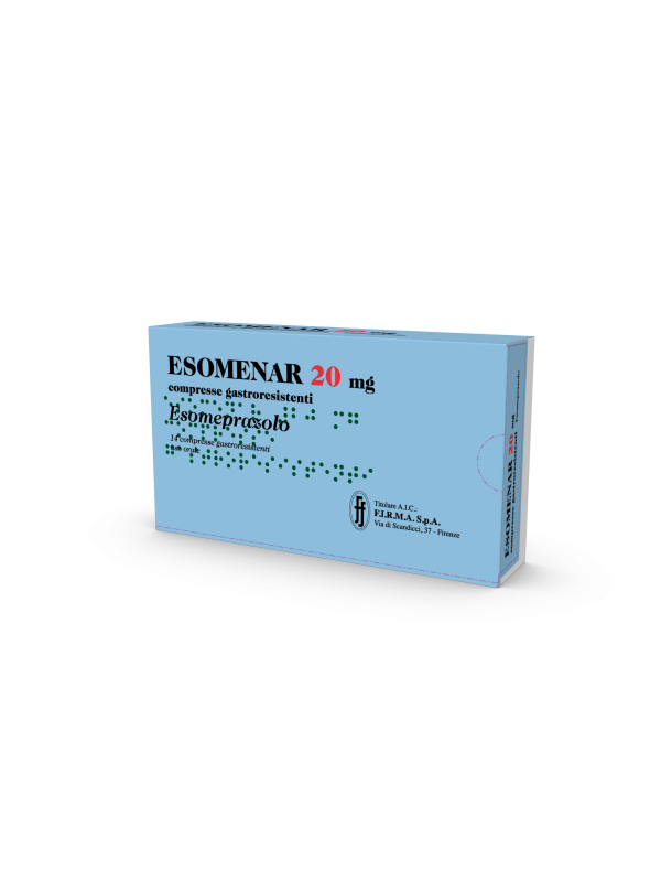 Posologia: La dose raccomandata è di 20 mg di esomeprazolo (una compressa) al giorno. Potrebbe essere necessario assumere le compresse per 2-3 giorni consecutivi per ottenere il miglioramento dei sintomi. La durata del trattamento è fino a 2 settimane. Una volta ottenuta la completa scomparsa dei sintomi, il trattamento deve essere interrotto. Se non si ottiene la risoluzione dei sintomi entro 2 settimane di trattamento continuo, il paziente deve consultare un medico. Popolazioni particolari. Popolazione pediatrica: Non esiste alcuna indicazione per un uso specifico di ESOMENAR nella popolazione pediatrica di età inferiore a 18 anni nell’indicazione: “trattamento a breve termine dei sintomi da reflusso (es. pirosi e rigurgito acido)”. Compromissione della funzionalità renale: Nei pazienti con funzionalità renale compromessa non è richiesto un aggiustamento della dose. In ragione dell’esperienza limitata nei pazienti con insufficienza renale grave, questi pazienti devono essere trattati con cautela (vedere paragrafo 5.2). Compromissione della funzionalità epatica: Nei pazienti con compromissione epatica da lieve a moderata non è necessario un aggiustamento della dose. Tuttavia, i pazienti con compromissione epatica grave devono essere consigliati da un medico prima di assumere ESOMENAR (vedere paragrafo 4.4 e 5.2). Anziani (≥65 anni): Negli anziani non è necessario un aggiustamento della dose. Modo di somministrazione: Le compresse devono essere ingerite intere con mezzo bicchiere di acqua. Le compresse non devono essere masticate o frantumate. Per i pazienti che hanno difficoltà di ingestione, le compresse possono essere disperse in mezzo bicchiere d’acqua non gassata. Non deve essere utilizzato nessun altro liquido in quanto il rivestimento enterico può dissolversi. Mescolare fino a che la compressa non si è disintegrata e bere l’acqua con i granuli immediatamente o entro 30 minuti. Sciacquare il bicchiere riempiendolo a metà d’acqua e bere. I granuli non devono essere masticati o frantumati.