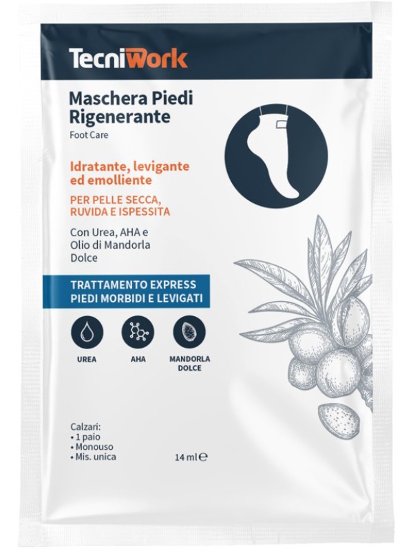 Maschera per Piedi Rigenerante, un vero e proprio trattamento Express per la pelle secca, ruvida e spessa del piede. In comodo e pratico calzare monouso, imbevuto di sostanze idratanti, emollienti e rigeneranti, è facile da indossare e da rimuovere. A base di Urea e Olio di Mandorla Dolce per idratare e nutrire la pelle e AHA per levigare e rendere i piedi morbidi e lisci.